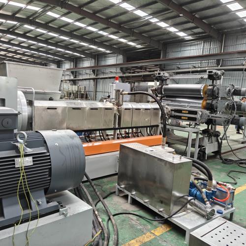 - 喂料系統(tǒng):部分需雙螺桿結(jié)構(gòu)或側(cè)喂料裝置,用于分開輸送基材和導(dǎo)電填料(尤其是高比例填料時),防止提前團聚堵塞。- 后續(xù)成型輔助:壓光、牽引等部件需避免刮擦或摩擦產(chǎn)生靜電(部分采用防靜電輥筒),確保片材導(dǎo)電性能穩(wěn)定。